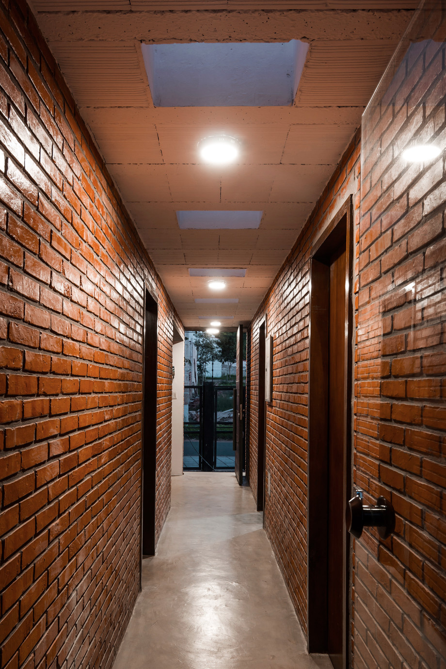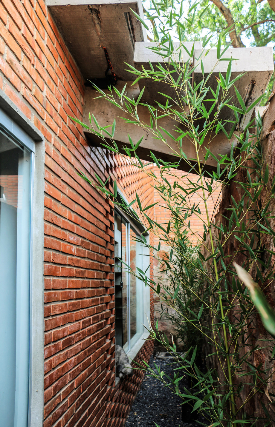 La fachada se compone en 2 bloques, uno con ladrillo visto abierto y otro con un filtro de ladrillos en convocó, que además de brindar sombra y privacidad, potencia la idea de timidez e introspección.