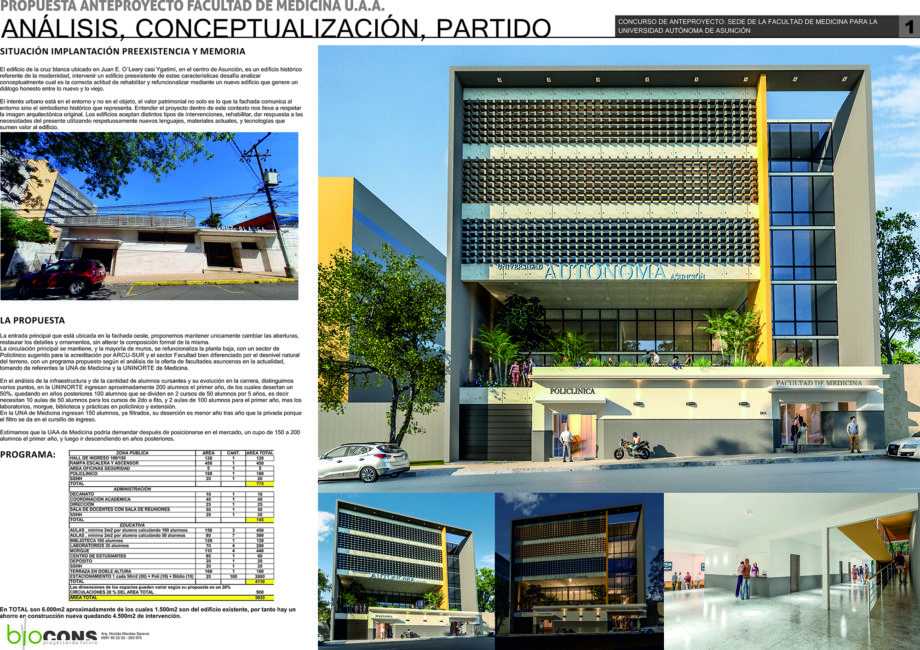 La circulación principal se mantiene, y la mayoría de muros, se refuncionaliza la planta baja, con un sector de Policlínico sugerido para la acreditación por ARCU-SUR y el sector Facultad bien diferenciado por el desnivel natural del terreno, con un programa propuesto según el análisis de la oferta de facultades asuncenas en la actualidad, tomando de referentes la UNA de Medicina y la UNINORTE de Medicina.