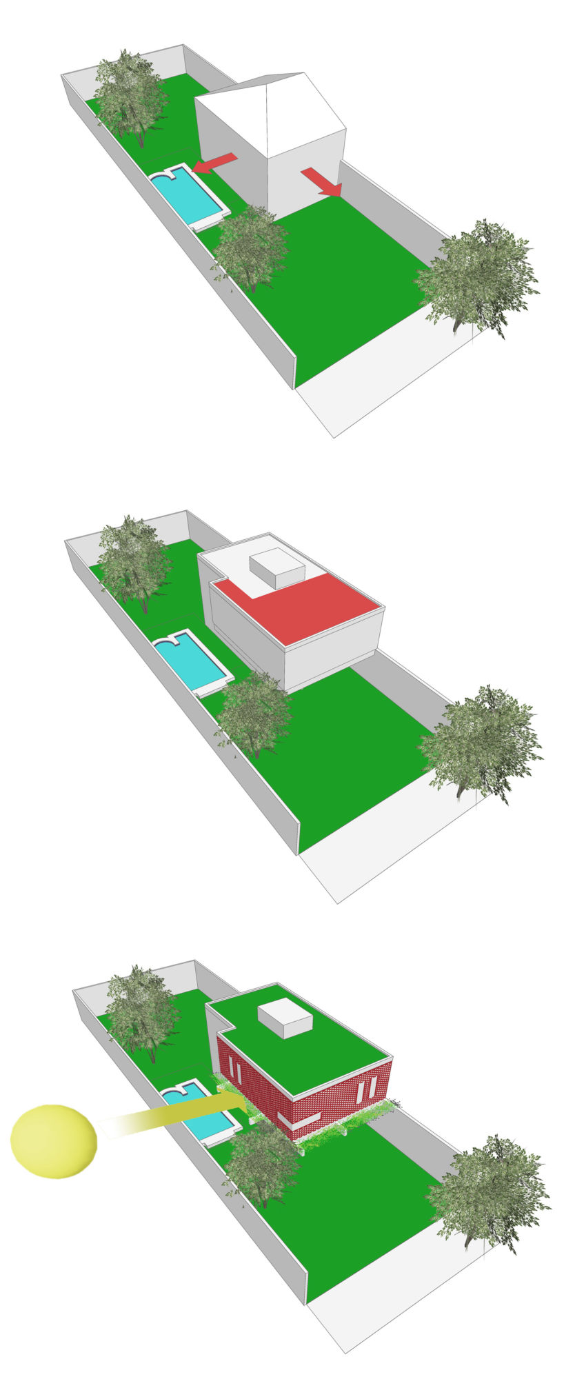 En esta otra intervención, se amplia la planta alta y se mejora su eficiencia energética orientada al Noroeste, mediante una doble piel un doble muro poroso y un techo también cerámico poroso con 30cm de masa.