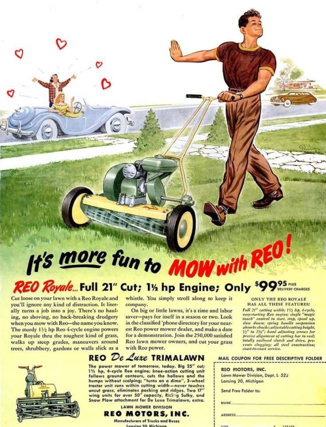 La revolución industrial trajo las primeras cortadoras de cesped, luego los aspersores automáticos y así fue como una tarea trabajosa (y costosa) como mantener un jardin prolijo, pasó a ser una necesidad de la clase media. La costumbre de cortar el cesped los fines de semana pegó fuerte en los EEUU.