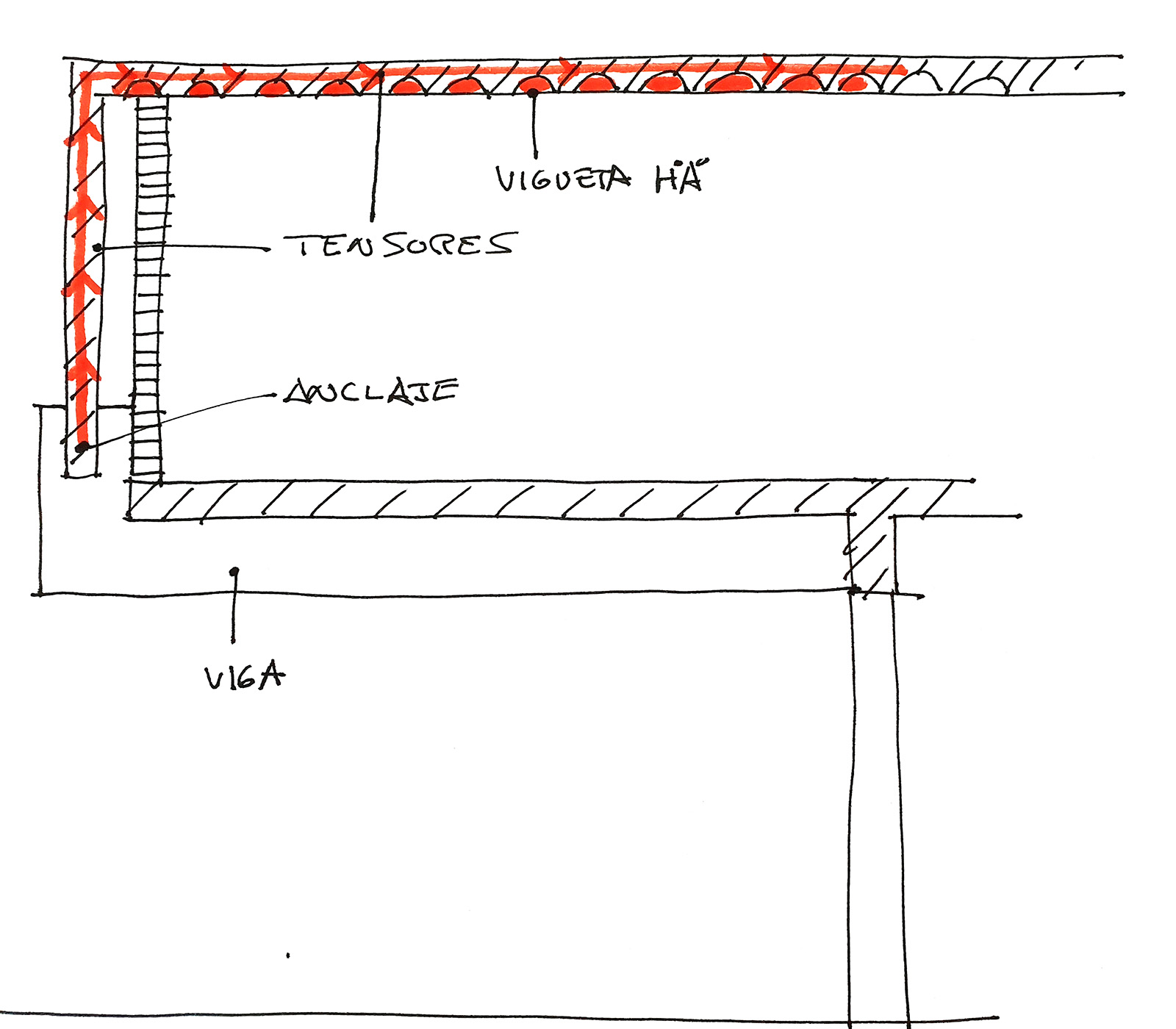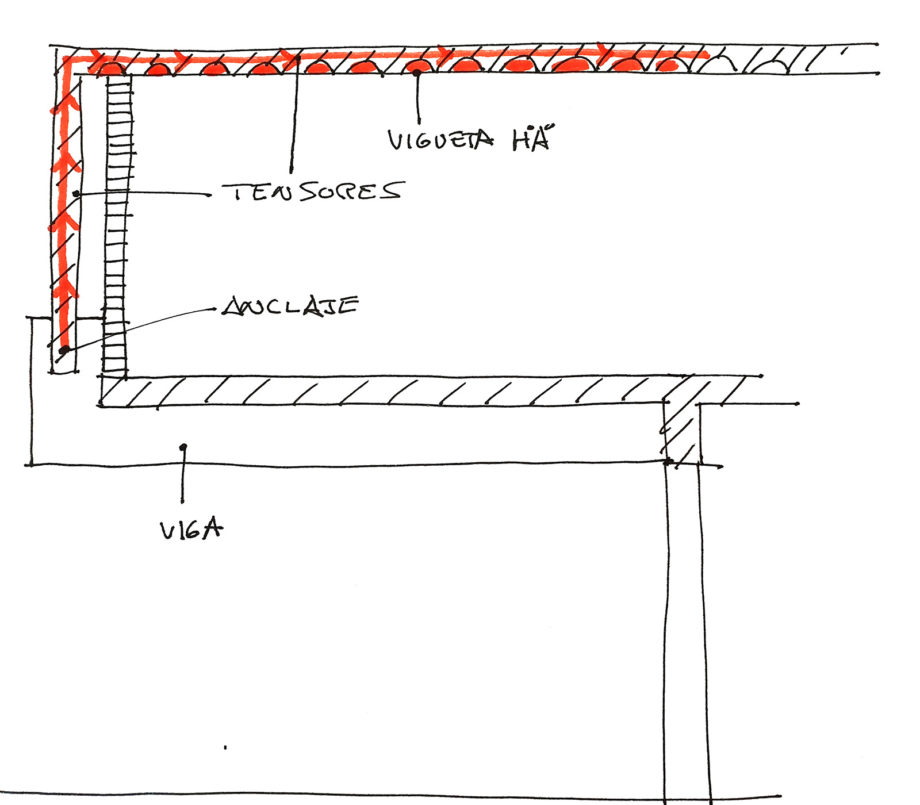 El voladizo se resuelve mediante una combinación de vigas, tensores desde el techo que atraviesan una viga muro ayudandole a las 2 vigas que vuelan lograr el equilibrio sin necesidad de pilares que obstaculizarían el estacionamiento.